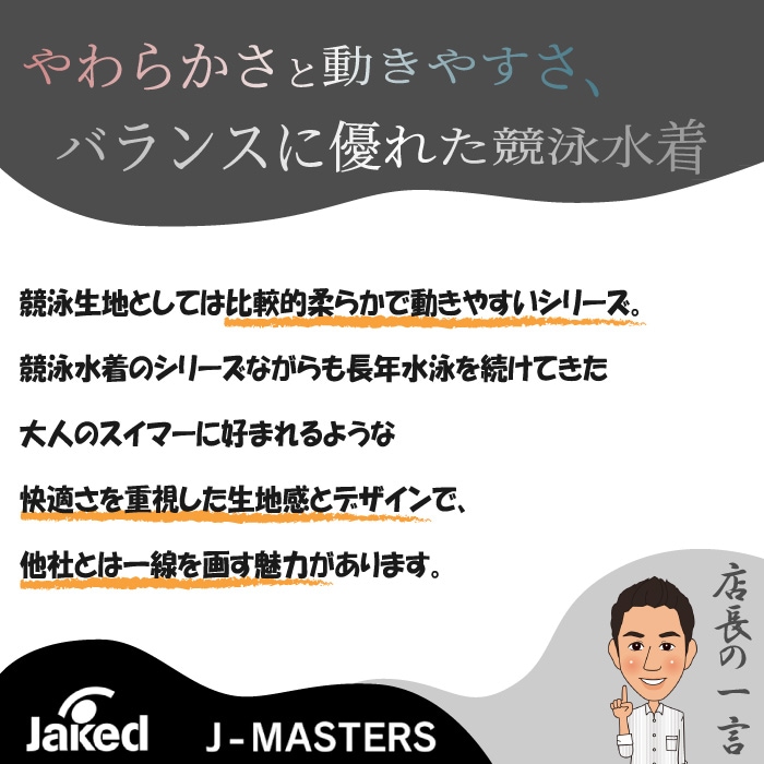 ※商品によって柄の出方・配置が異なります。 J-ELASTICO for MASTERS 【ジェイ・エラスティコ フォーマスターズ】 ELASTICOシリーズで使用している生地をメインに使用し、切り替えの柄生地のみ、J-MASTERSの生地を使用。 初めて試合に参加されるマスタース?スイマーへ ・動きにフィットする伸ひ?と柔らかさ ・初めてレースに着用する水着としても、安心感のある厚手生地 |